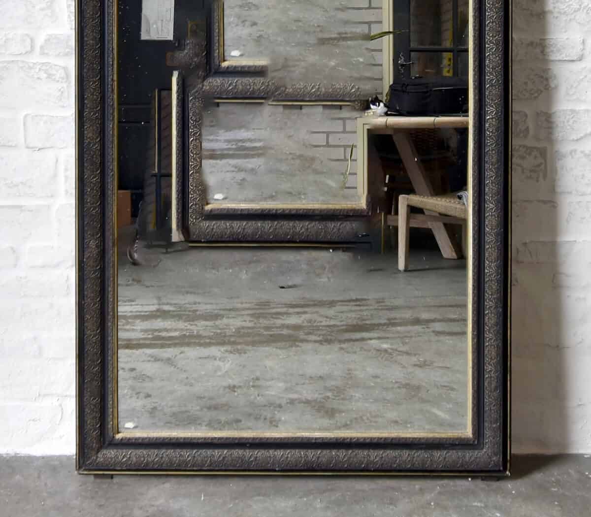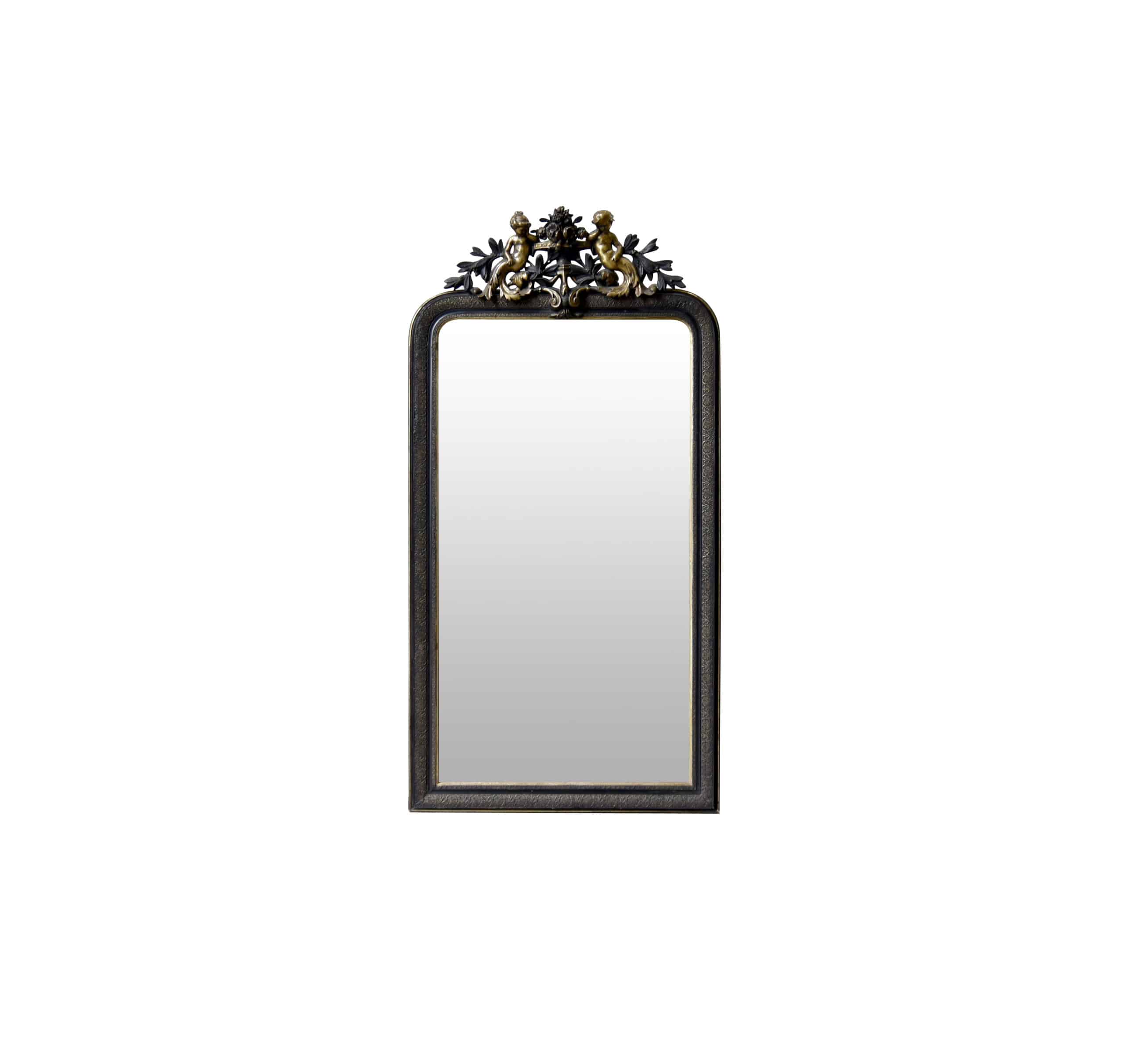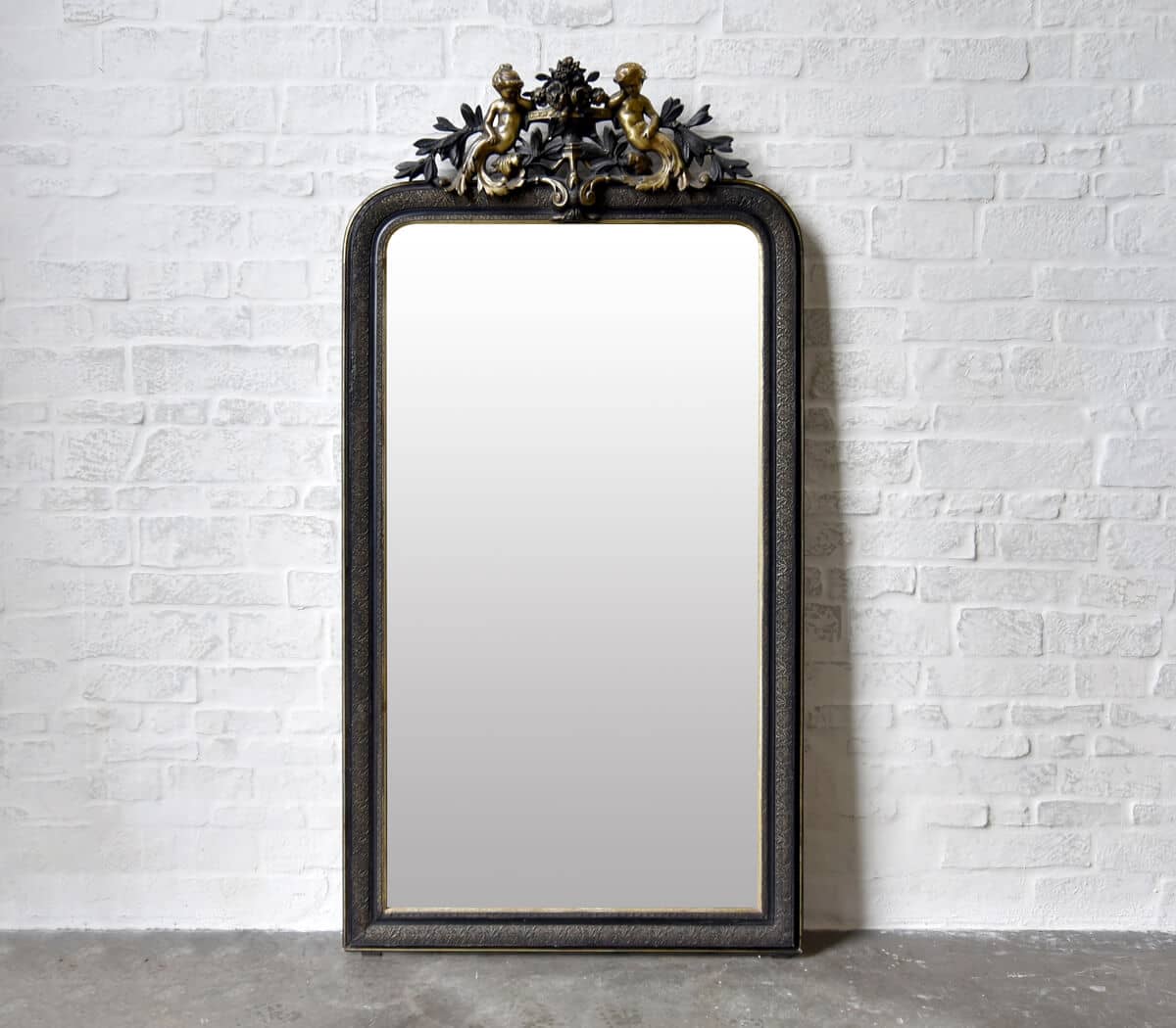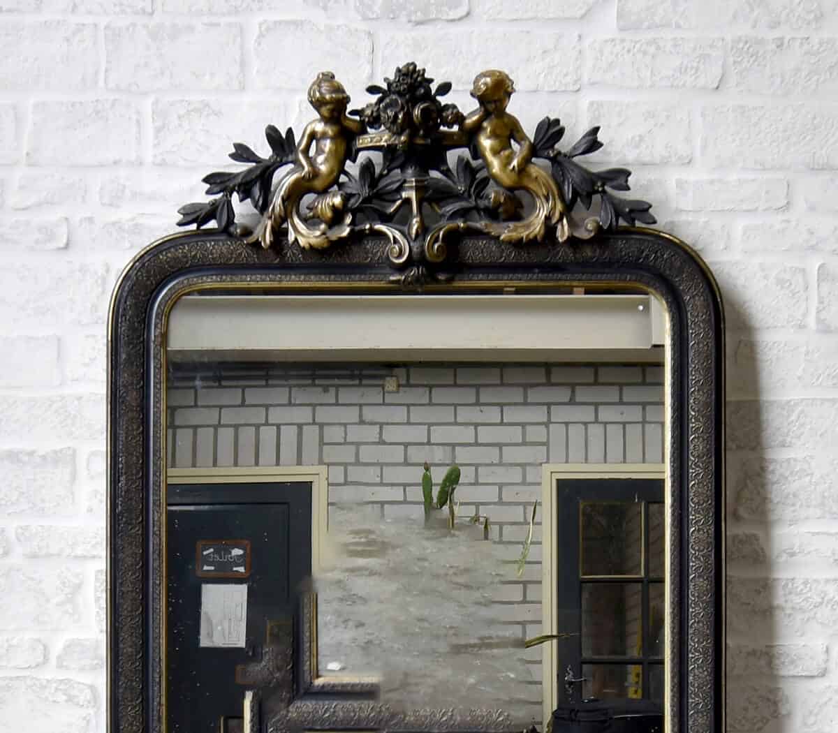 Dieser antike Spiegel hat ein Ornament mit Engeln und einen schön verzierten Rahmen.