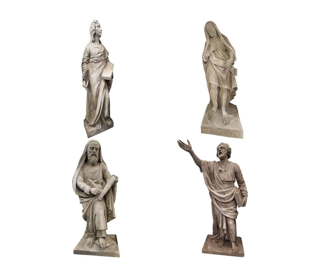 Deze set van 4 Euville stenen beelden komen uit de voorgevel van de Sint Carolus Borreuskerk Antwerpen.