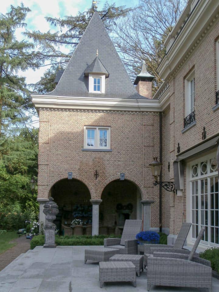 Gevels van gerecupereerde metselstenen en terras van Belgisch hardsteen
