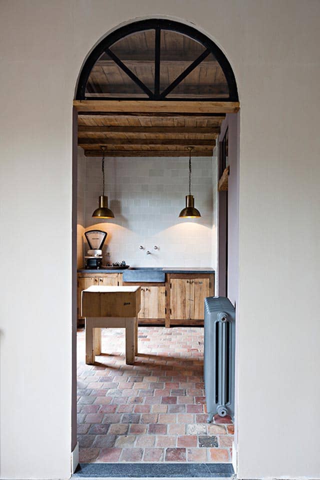 HomeKeukenmeubel van oud eiken en Belgisch hardsteen op antieke plavuizen