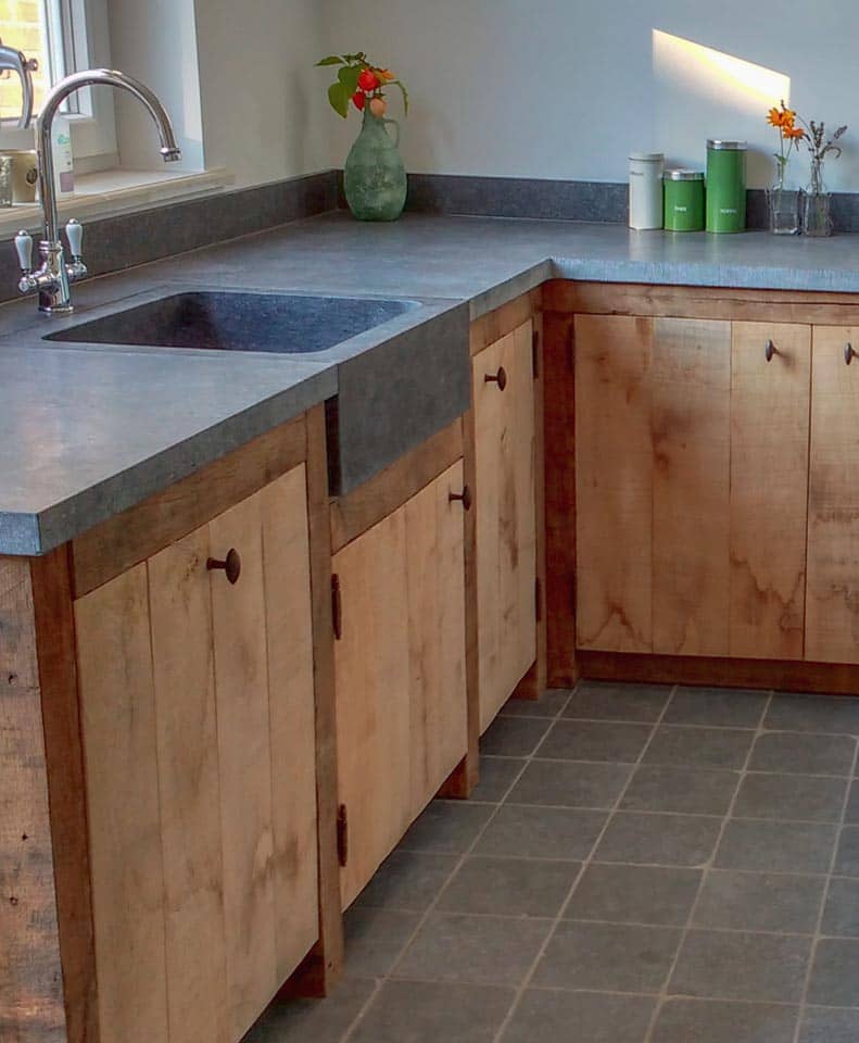Maatwerk keuken van oud eiken en Belgisch hardsteen