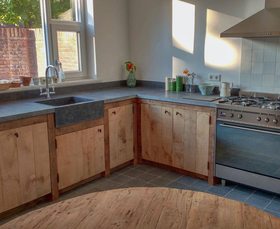 Maatwerk keuken van oud eiken en Belgisch hardsteen