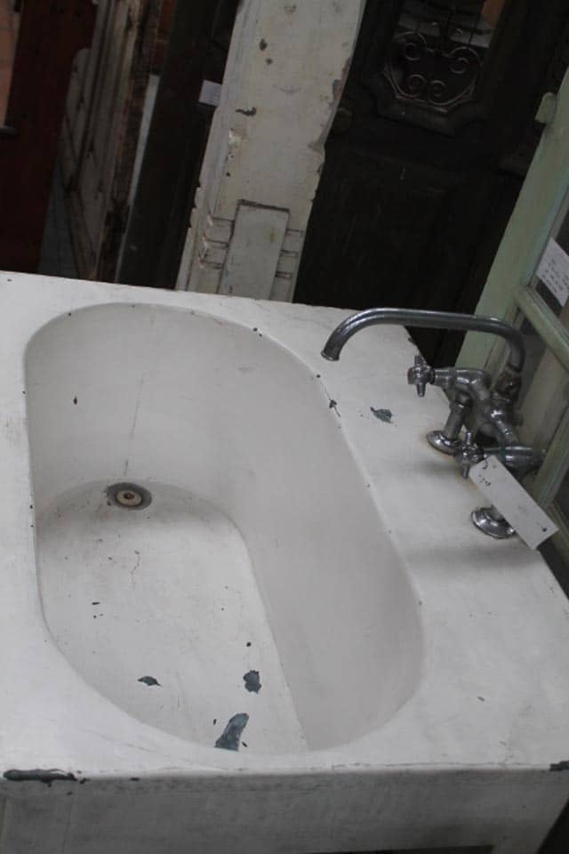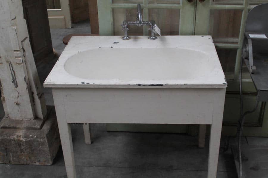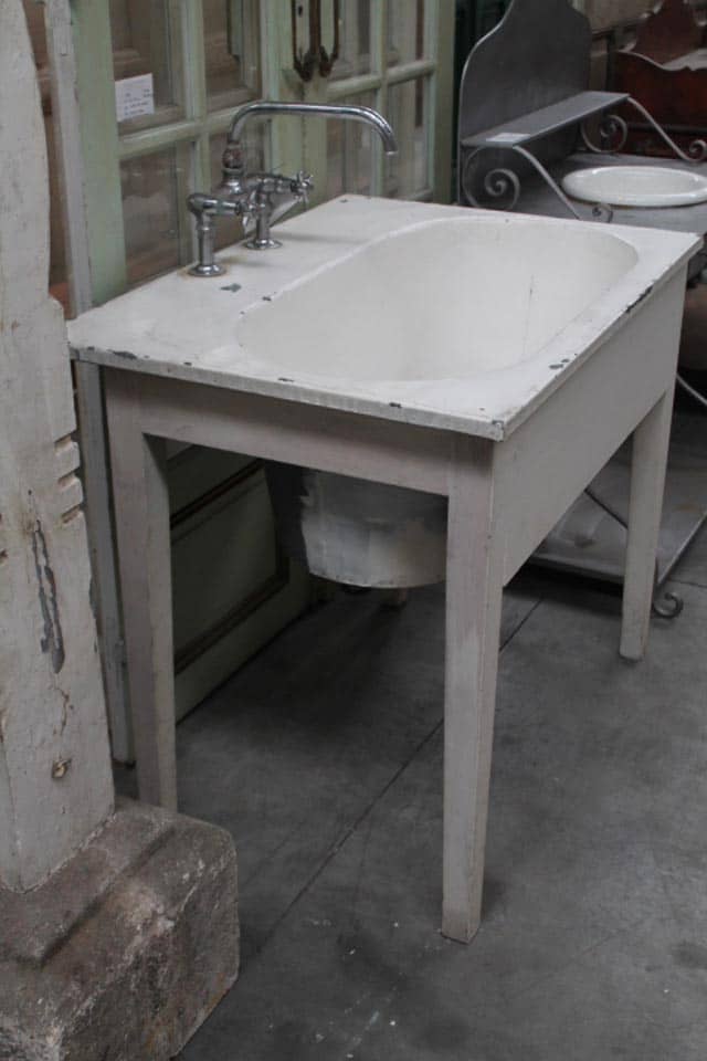 Oude wastafel, met loden blad en bak, met kraan-set.