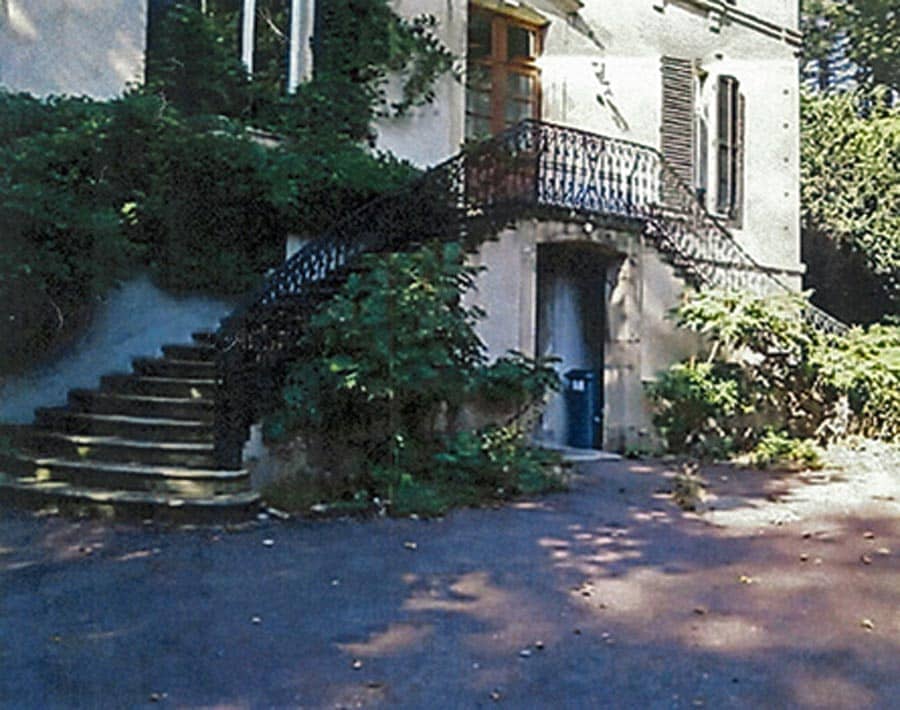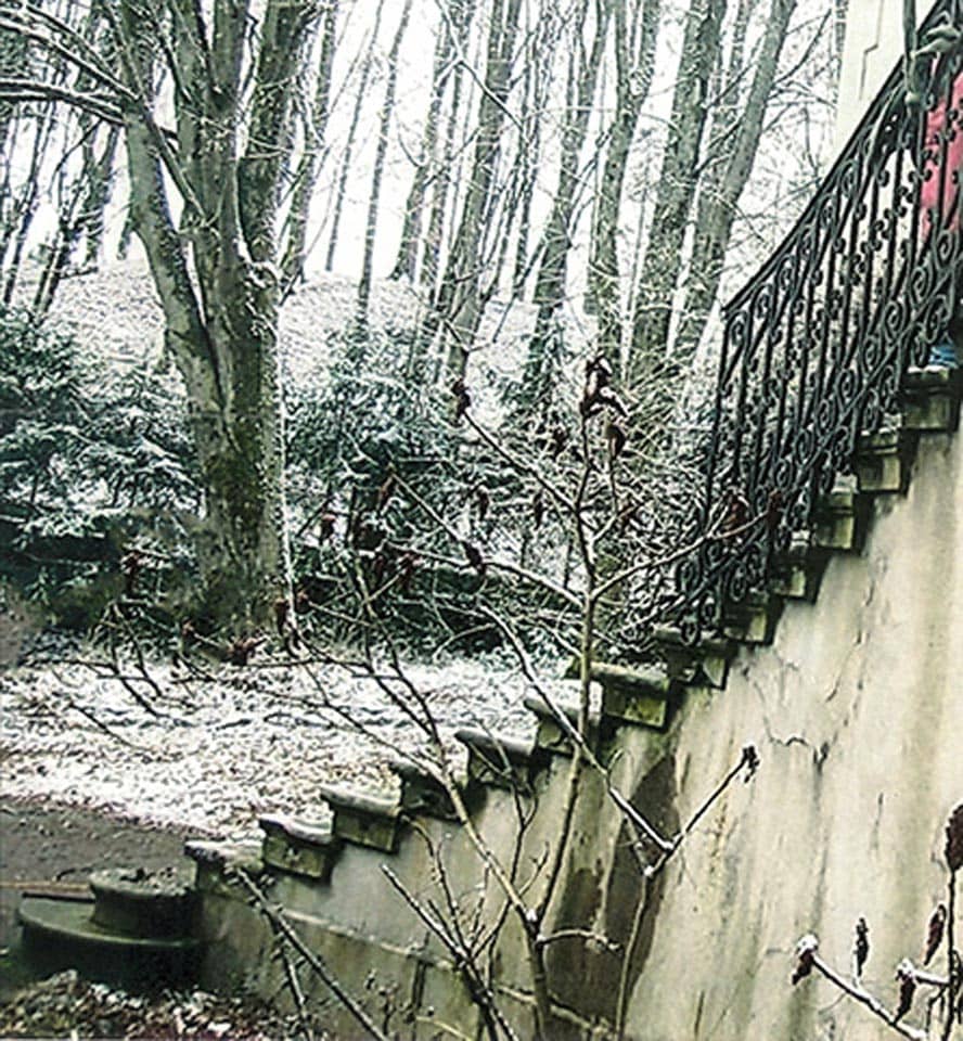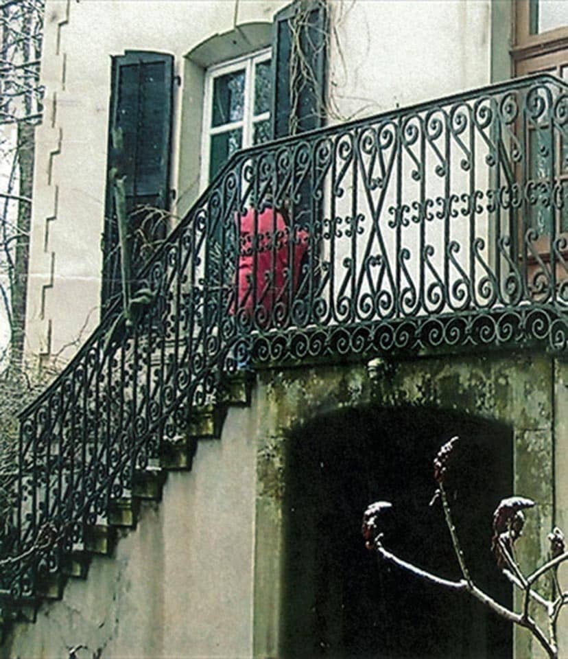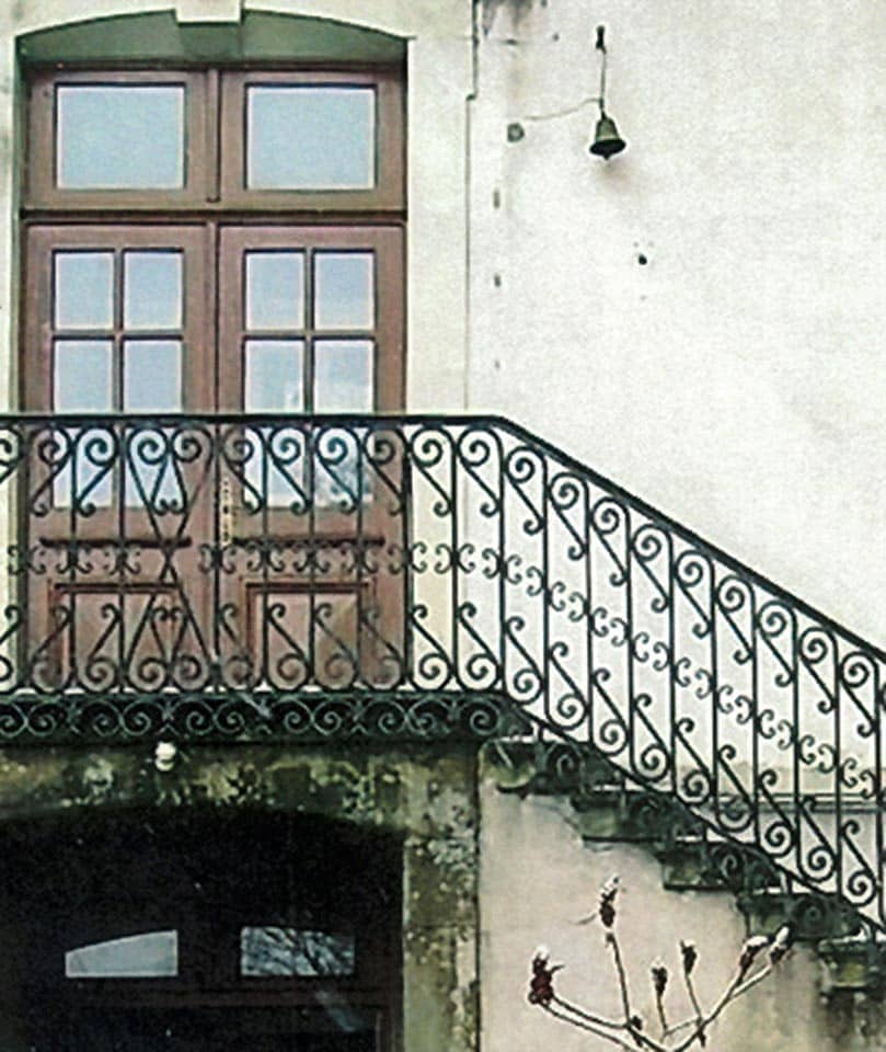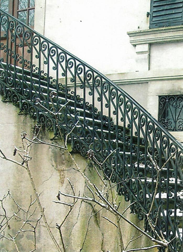 Stenen trap van 15 treden hoog incl. ijzeren leuning-hekwerk en bordes.