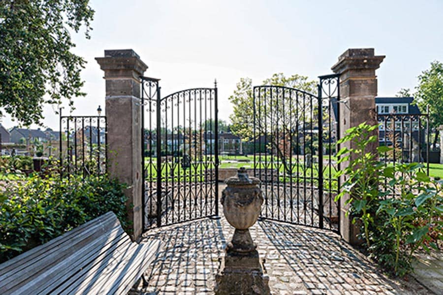 Vaas op sokkel voor een antieke poort met zandstenen zuilen